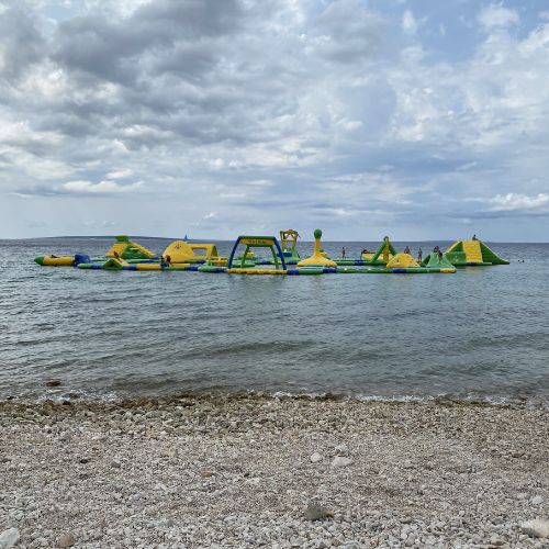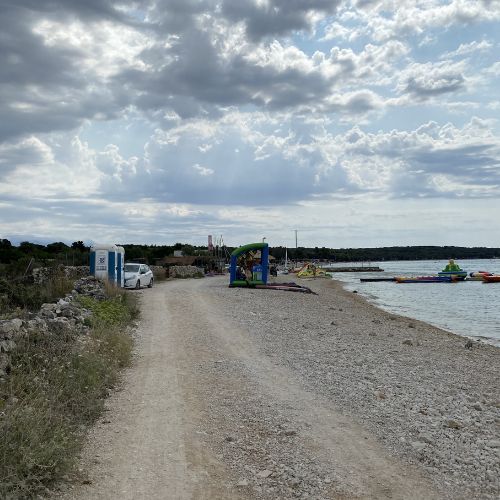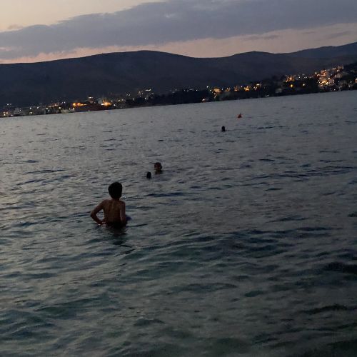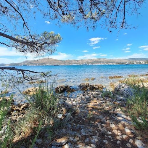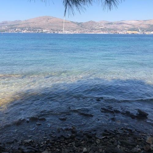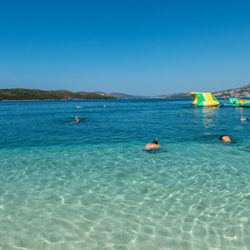 We based ourselves in Okrug Gornji on Čiovo Island just outside Split. This stretch of coast surprised us. You could go from inflatable chaos to total quiet in under ten minutes. It became one of our favorite bases in Croatia. Here’s what we swam at.