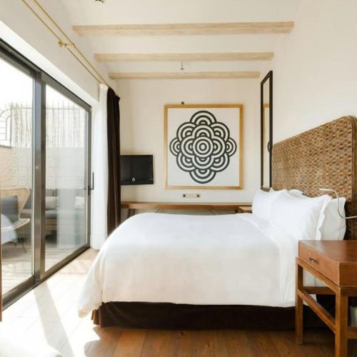 Why Stay Here: Hip 19th-century building turned wellness-focused urban hotel. Catalan tiles meet geometric wallpaper and modern fabrics. Yoga mats in every room, rooftop yoga and pilates classes, healthy juice bar with vegan options. Free bikes to explore Barcelona. Mix of room types from basic to suites with hammocks and private terraces. Satan’s Coffee Corner in the lobby serves some of Barcelona’s best specialty coffee. Eclectic design and local vibe. Great for wellness-focused travelers who want authentic neighborhood atmosphere.
