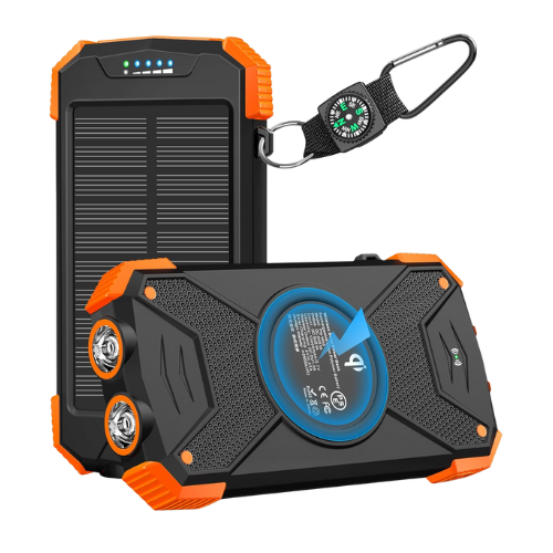 A portable solar power bank with a built-in flashlight. Useful for long travel days, beaches, camping or emergencies.