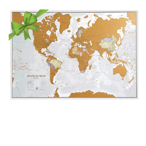 A scratch-off map that makes it easy to track countries you have visited. Looks clean on a wall and makes a good gift for teens or adults.