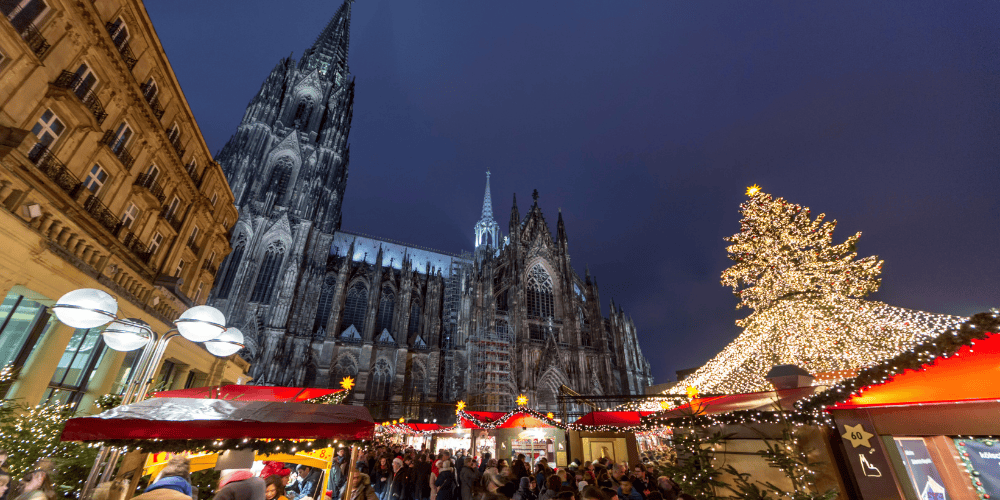 Cologne is one of our favorites. There are seven markets across the city, each with its own theme. The Cathedral market is the highlight, set beneath the towers and lit with thousands of stars. We’ve stood here with mugs of glühwein while the choir sang and it’s pure Christmas. The smaller markets near the river are great for food and views. They also have a Christmas train that will take you to all the markets.