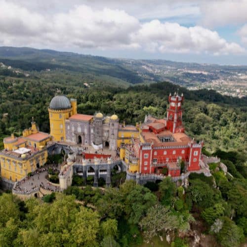 Sintra is the main event. A UNESCO Cultural Landscape, a small hill town filled with palaces built over centuries. The Palácio Nacional da Pena is the most famous, a colorful Romantic era palace perched above the town. Quinta da Regaleira is more interesting, a Gothic estate with towers, underground tunnels and an initiation well that descends through a spiral staircase.