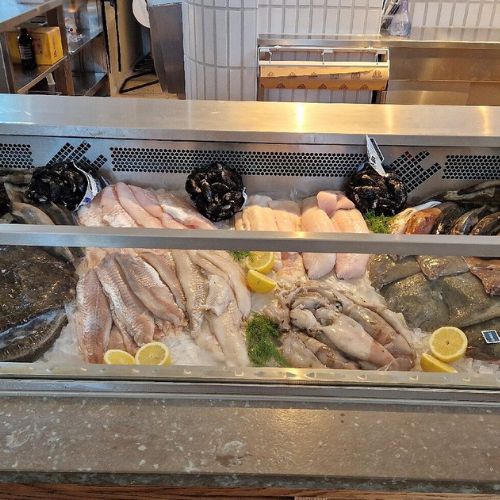 Inside, it felt quiet and polished. You could buy fish, but most of the space was made up of bars and restaurant-style counters. Everything felt very controlled and very fancy, to the point where it almost felt like you had to lower your voice. It reminded us more of a high-end restaurant space than a working market.